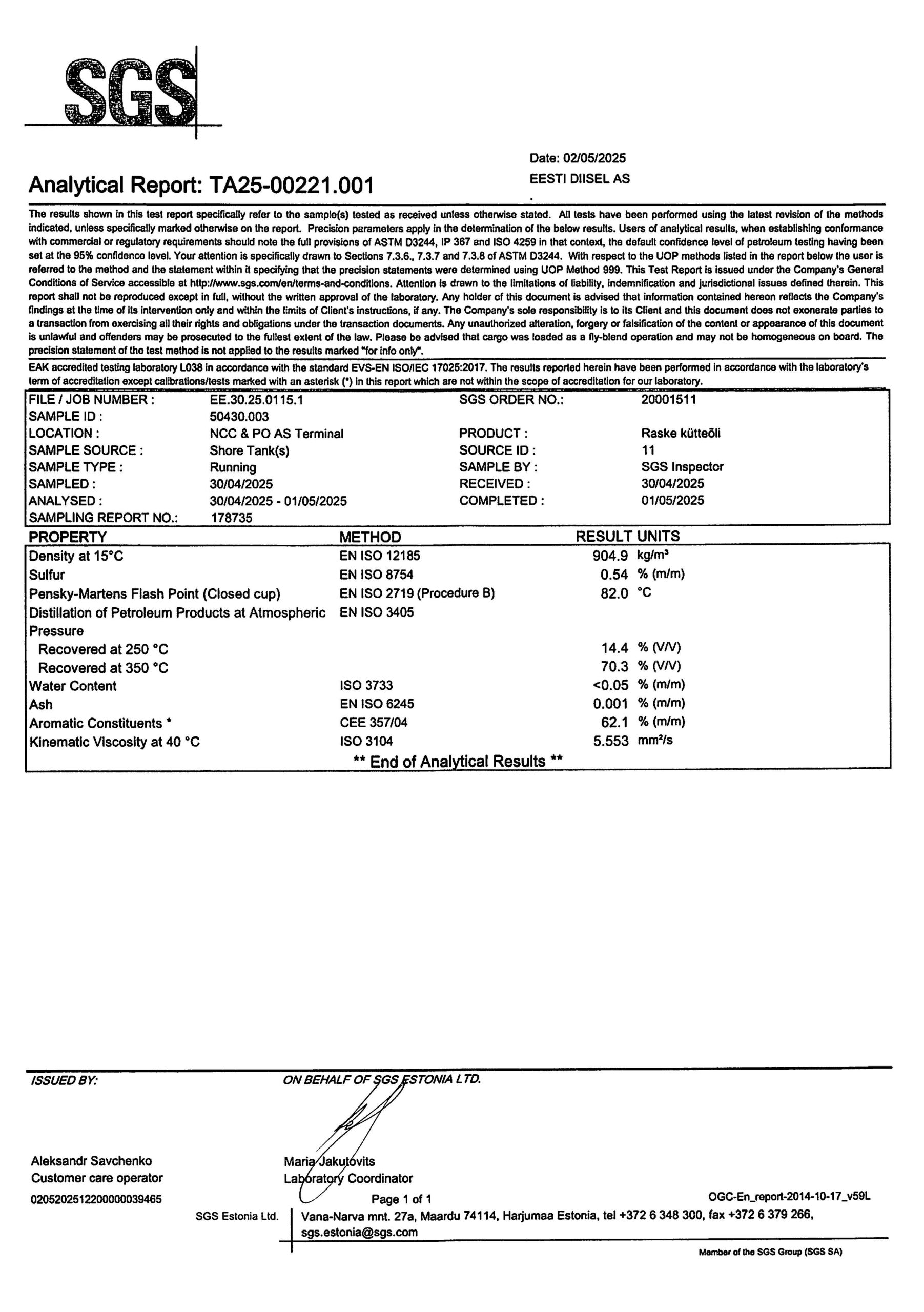 Eesti Diisel AS-i toodetav raske kütteõli vastab täielikult Keskkonnaministeeriumi nõuetele (määruse №73 lisa 7, 20.12.2016). Iga partii on sertifitseeritud rahvusvahelise sõltumatu labori poolt.